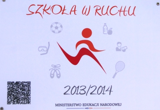 Ogromną radość sprawiła nam informacja, że nasza szkoła otrzymała tytuł „Szkoła w ruchu 2013/2014”. Nadanie tytułu wiąże się z otrzymaniem tabliczki „Szkoła w ruchu”. Otrzymaliśmy również związany z tym list gratulacyjny Pomorskiego Kuratora Oświaty.