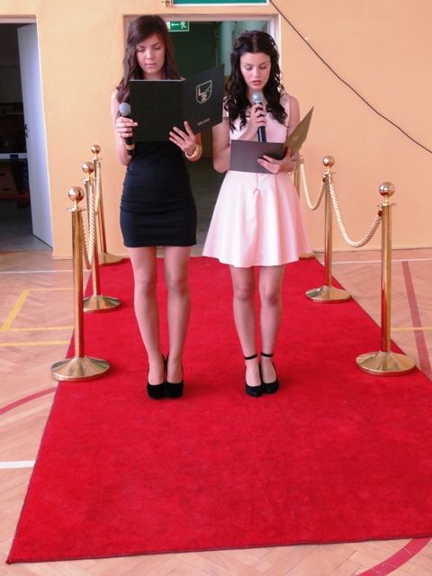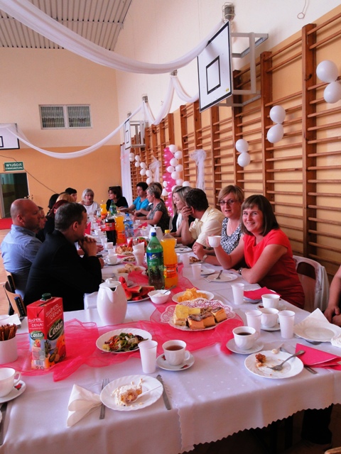 Uroczystość rozpoczęła się o godzinie 17.00 przywitaniem nauczycieli, dyrekcji, rodziców oraz licznie przybyłych uczniów klasy II gimnazjum. Następnie wszyscy mieli okazję posmakować pyszności przygotowanych przez nasze kochane mamy. Po posiłku przyszedł czas na główną atrakcję wieczoru - taniec belgijski. Jak się okazało stres był zupełnie niepotrzebny! Goście byli mile zaskoczeni, co wyrazili gromkimi brawami.