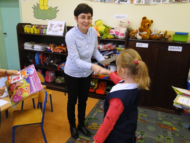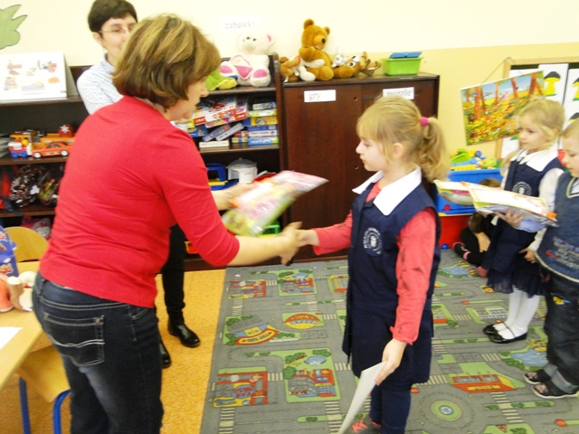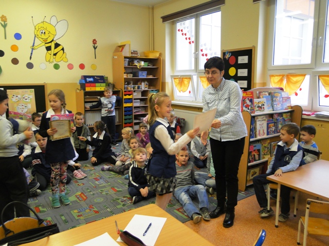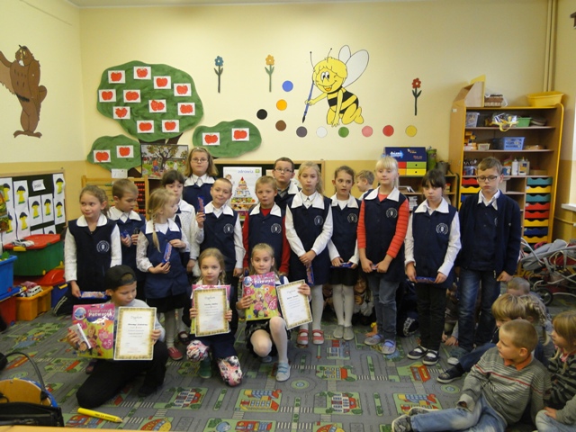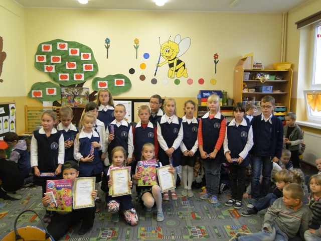 Nagrodzeni otrzymali upominki, które umilą długie jesienne wieczory; filcowe robótki – potworki , do samodzielnego wykonania, kolorowe kubki i pluszaki. Wszyscy uczestnicy otrzymali także słodycze. Pani Beata Kornela pochwaliła ,,małych artystów” za wspaniałe występy i zachęciła do wzięcia udziału w konkursie w przyszłym roku.