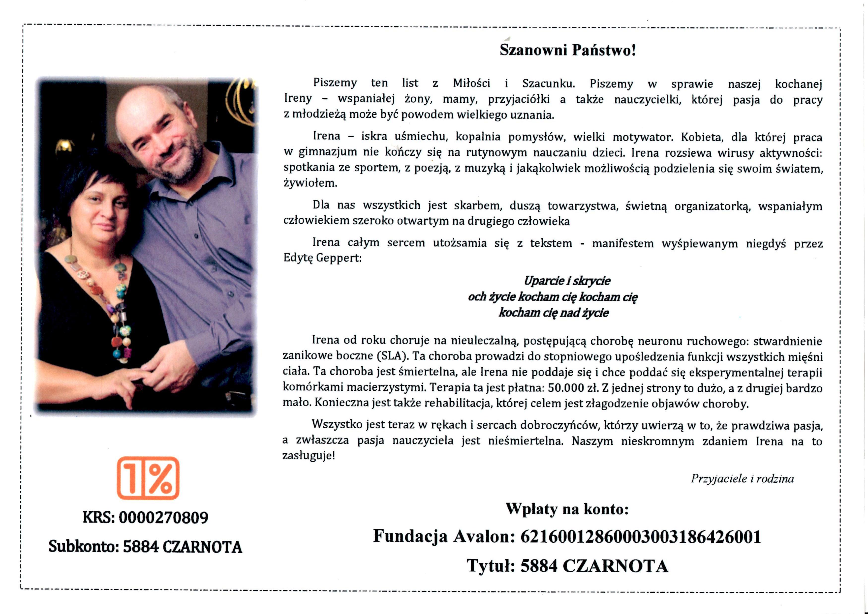 Społeczność naszej szkoły postanowiła włączyć się w zbiórkę pieniedzy na kosztowną terapię i rehabilitację Pani Ireny.