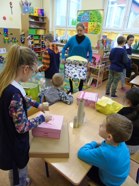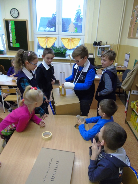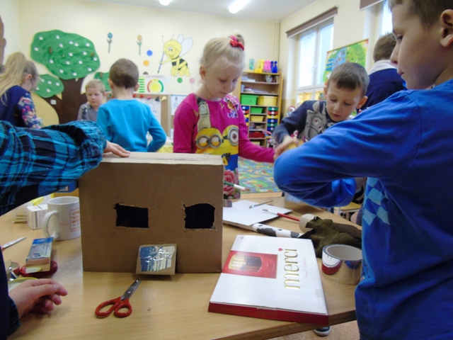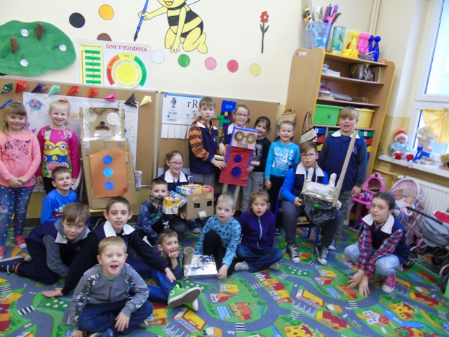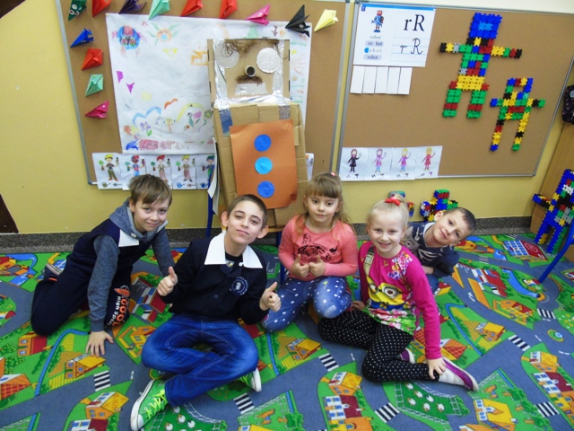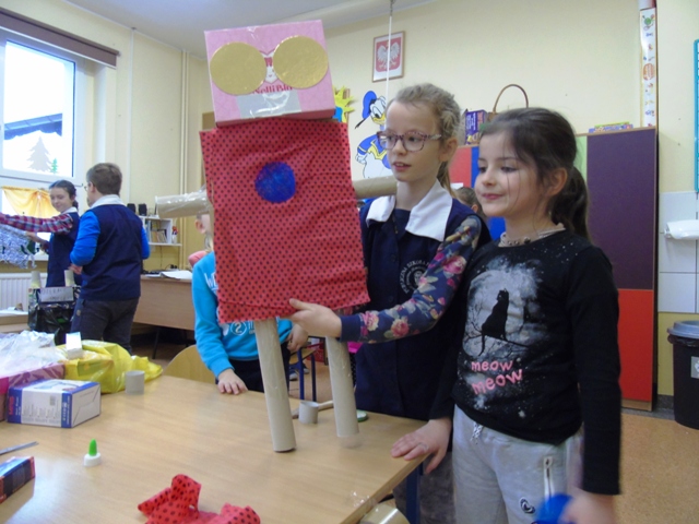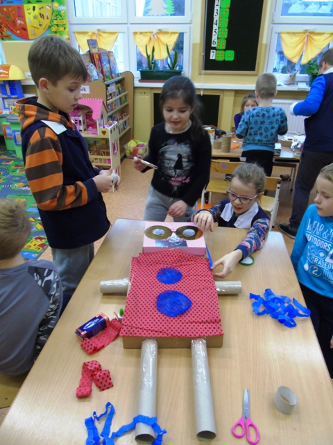 Uczniowie klasy IV zaproszeni zostali dnia 23. lutego br. na zajęcia techniczne do oddziału przedszkolnego. Efektem współpracy były roboty zrobione z pudełek, kartonów i materiałów papierniczych. Praca uczniów przebiegała w miłej i sympatycznej atmosferze, Umiejętności czwartoklasistów imponowały przedszkolakom. Ci zaś mogli liczyć na pomoc starszaków. Uczniowie kl. IV już czekają na kolejne zaproszenie.