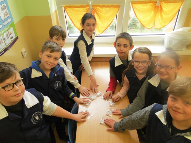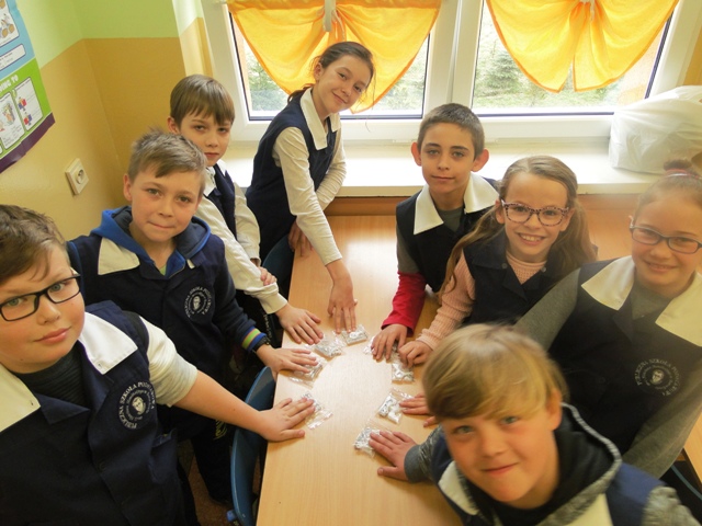 Po powtórce z bezpieczeństwa nadszedł czas na prezenty. Każdy przedszkolak i uczeń szkoły podstawowej otrzymał odblask Kubusia.