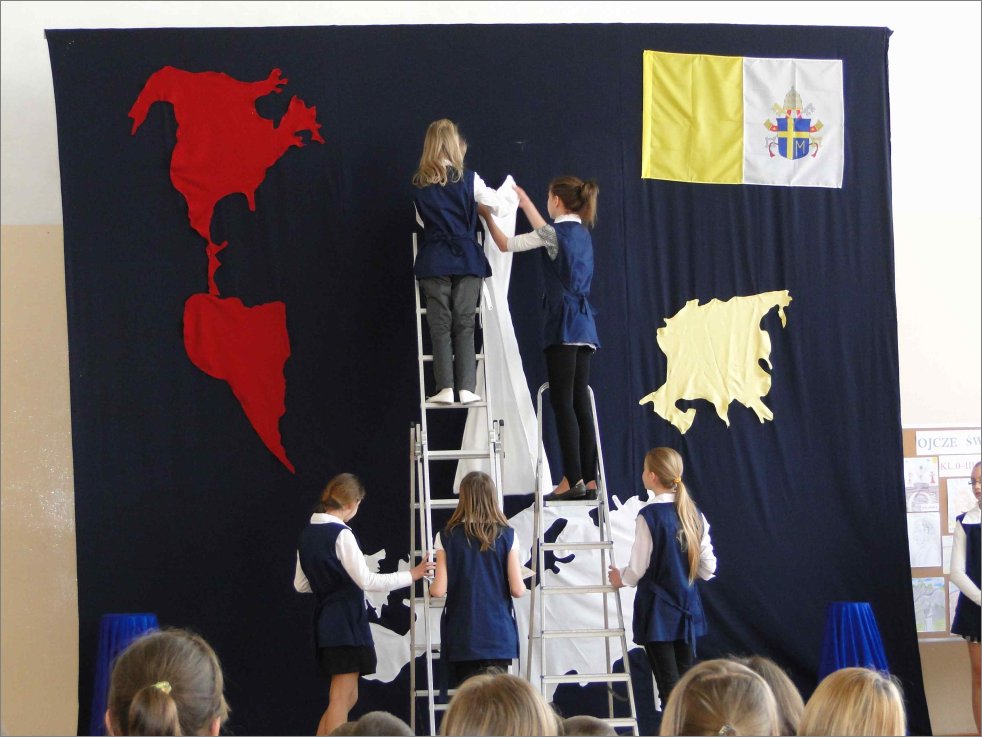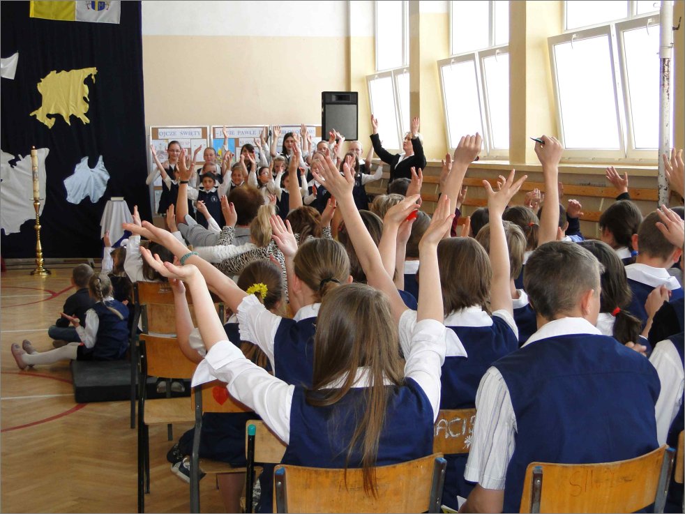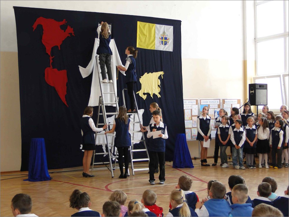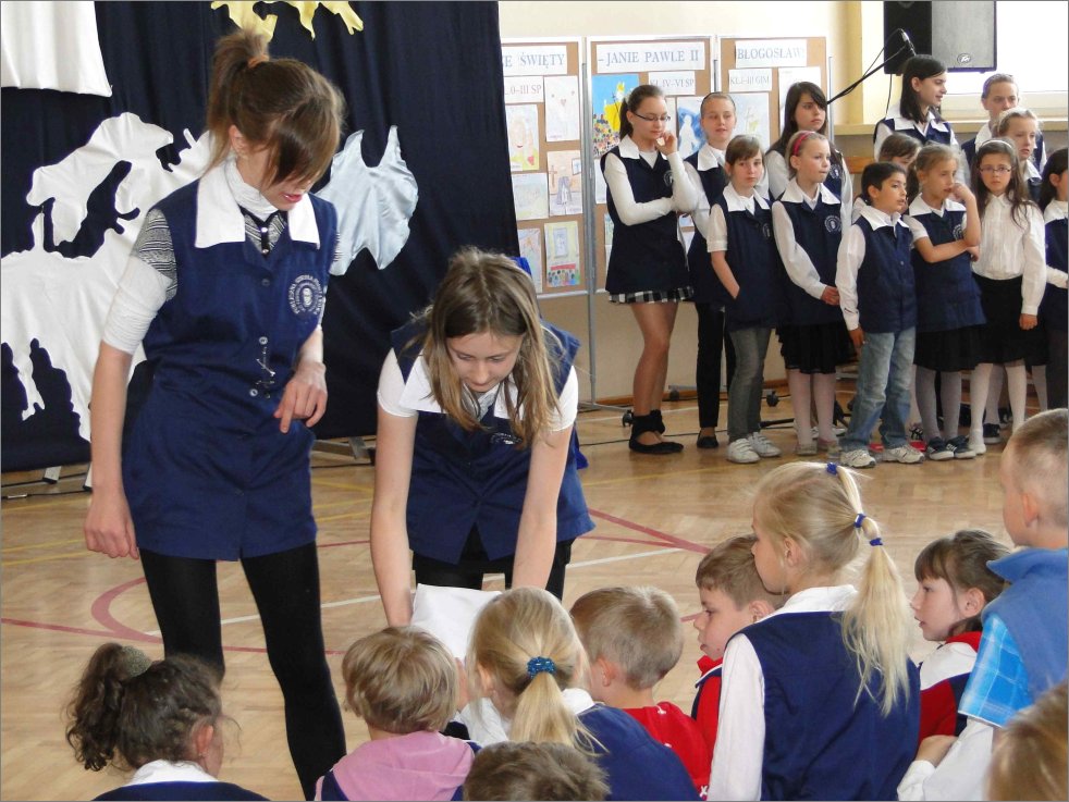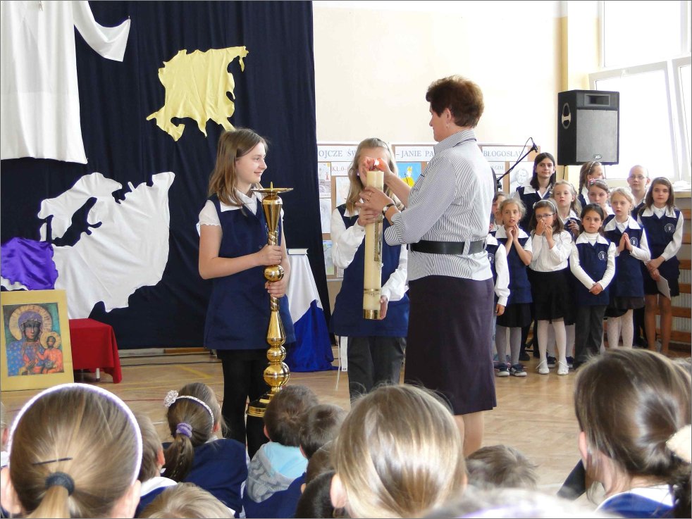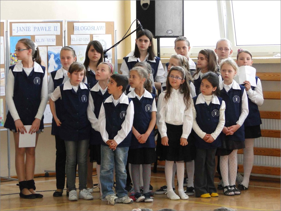 1 maja 2011 roku to kolejna data, którą zapewne zapamięta wiele osób. W tym dniu obecny Papież Benedykt XVI ogłosił zmarłego przed sześciu laty JANA PAWŁA II BŁOGOSŁAWIONYM. Cieszymy się ogromnie, że tak szybko nasz ukochany Ojciec Święty został wyniesiony do CHWAŁY OŁTARZY. Jednak zanim ten dzień nastąpił wspólnie przygotowywaliśmy się do tego wydarzenia. Już nasze rekolekcje wielkopostne odbywały się pod wspólnym hasłem: DUCHOWE PRZYGOTOWANIE DO BEATYFIKACJI JANA PAWŁA II. Zajęcia w szkole, a szczególnie szkolna katecheza to również czas na przygotowanie dzieci i młodzieży na ten wspaniały dzień. Punktem kulminacyjnym poprzedzającym dzień pierwszego maja był uroczysty Apel, który odbył się w piątek 29 kwietnia 2011r. Przedstawienie, jakie przygotowali uczniowie szkoły podstawowej pod okiem katechetów i innych nauczycieli, Pani Dyrektor Maria Tomana nazwała "inną katechezą". Wykorzystując "KETT-METODĘ", jako drogę przeżywania wartości i osobliwego dialogu uczniowie poznali w ten sposób postać Lolka, Karola, aktora, studenta, kapłana, profesora, biskupa, kardynała i wreszcie papieża. Na zakończenie Pani Dyrektor nagrodziła uczniów, którzy przygotowali i oddali prace plastyczne w naszym szkolnym konkursie. Także odniosła się do Patrona Szkoły O. Flawiana Słomińskiego, który znał się osobiście z Janem Pawłem II oraz był Jego spowiednikiem.
