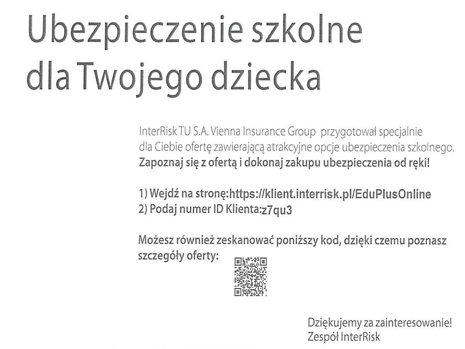 Polisa EDU-A/P nr 055080 na nowy rok szkolny 2018/2019 została przekształcona w wirtualną, która umożliwia rodzicom uczniów szkoły samodzielne wystawienie Polisy NNW szkolne EDU PLUS INTERRISK.