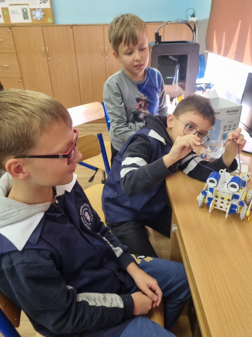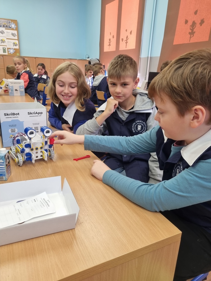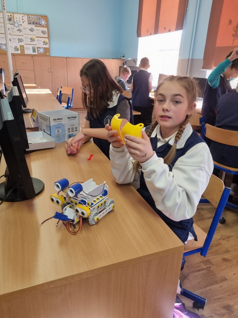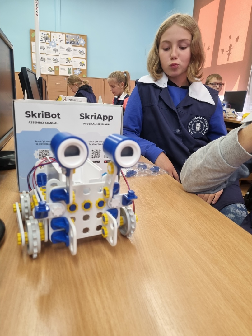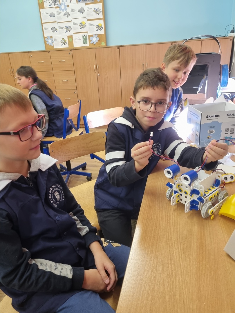 Uczniowie klas II- VII w październiku rozpoczęli cykl zajęć z zestawami SkriBot Steam ze Skriware zakupionymi w ramach Laboratorium Przyszłości. SkriBot to zestawy pozwalające na samodzielne stworzenie robota edukacyjnego do programowania. Edukacja zaczyna się na etapie budowania go od zera. Dzięki technologii Skriware uczniowie poznają podstawy mechaniki i elektroniki.
