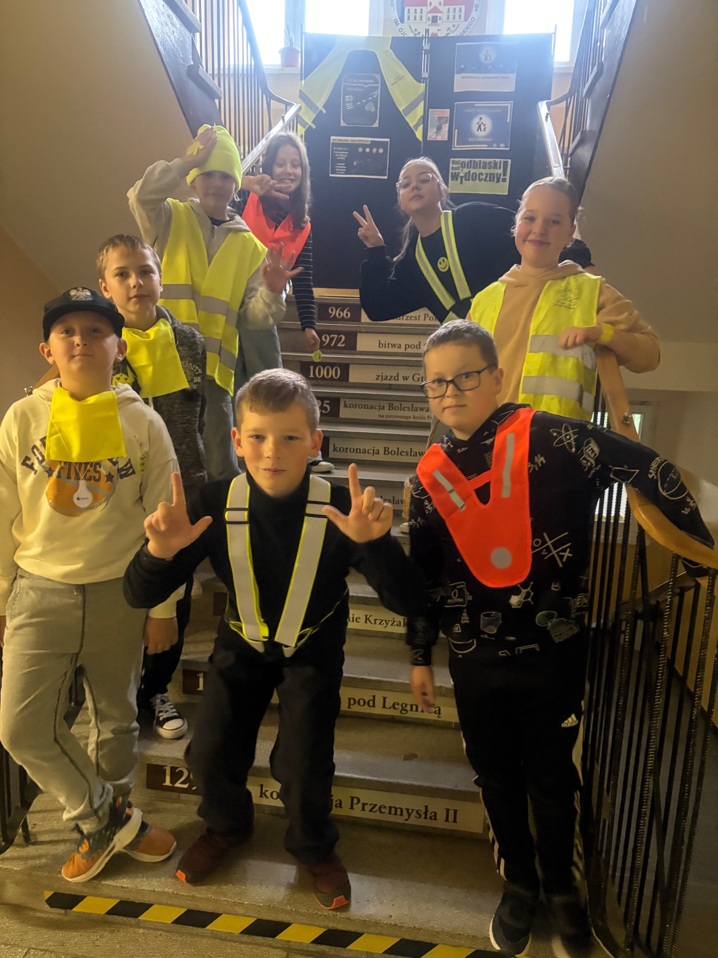 Wszyscy uczniowie wystąpili w kamizelkach i opaskach odblaskowych, świecąc przykładem dosłownie i w przenośni!