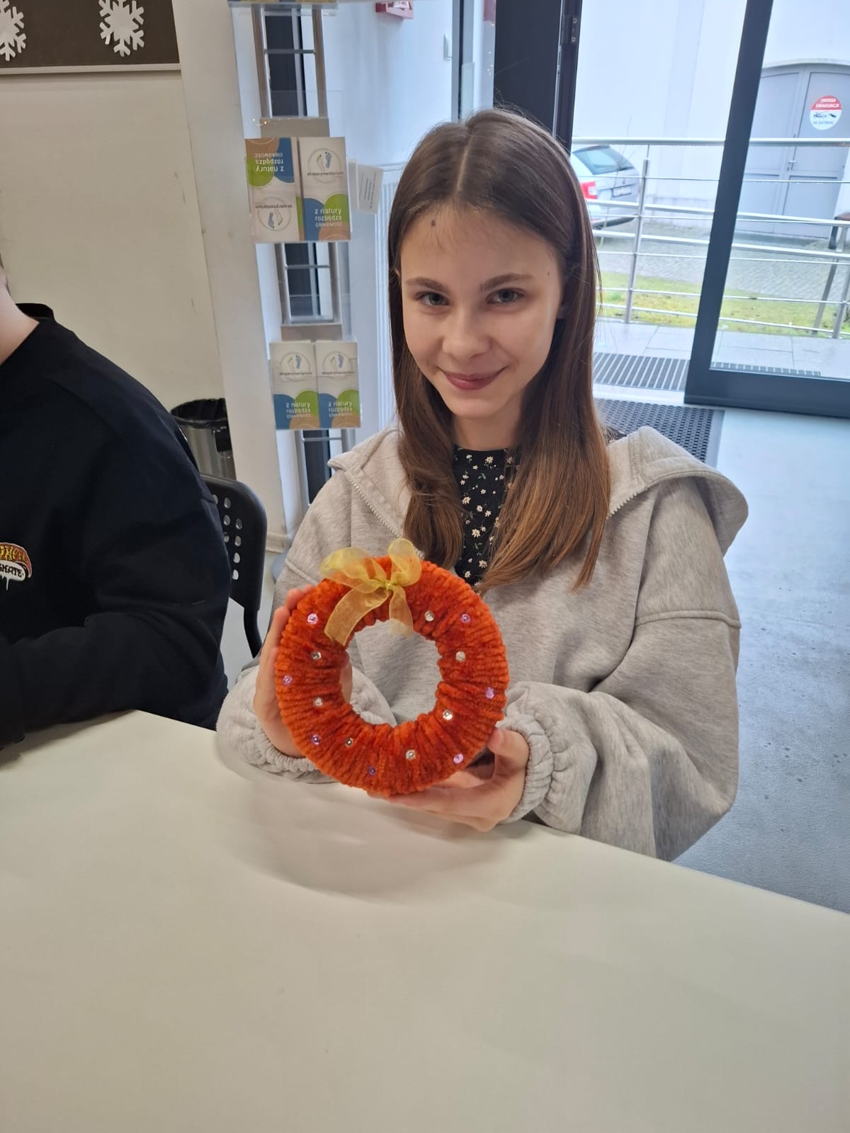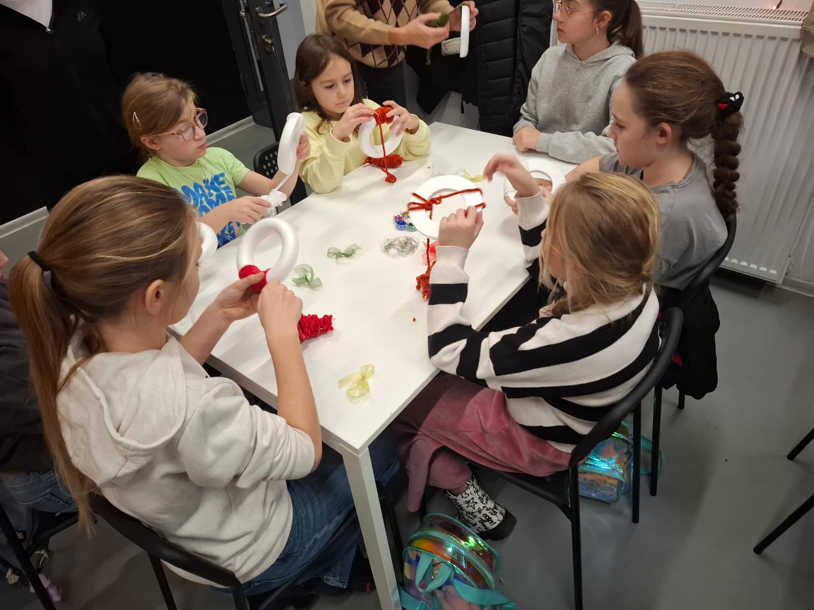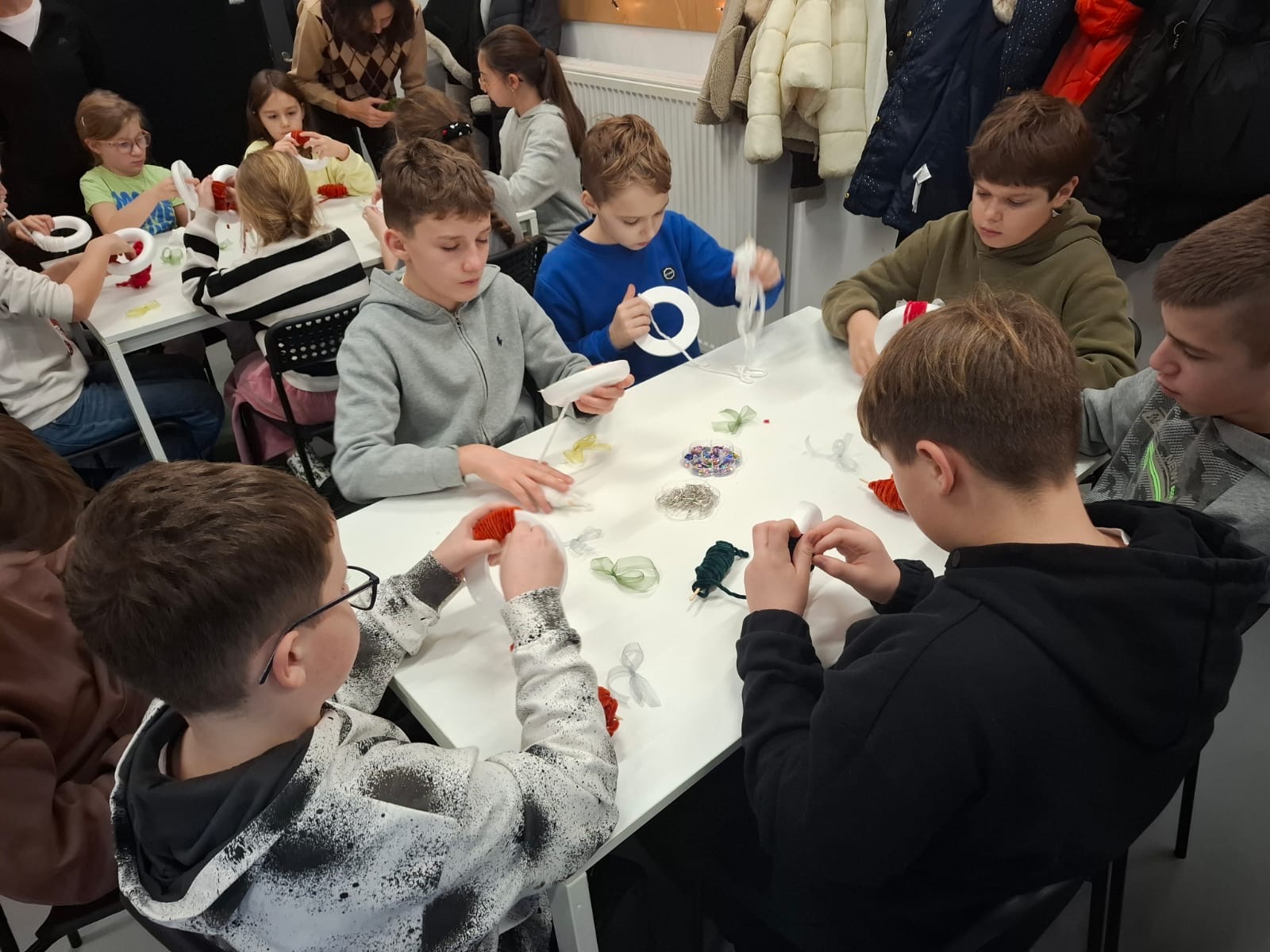W nastrój świąt wprowadziły uczniów warsztaty plastyczne, podczas których każdy z uczestników stworzył przepiękny wieniec z włóczki, który mógł ozdobić kolorowymi cekinami, wstążkami, a następnie zabrać ze sobą do domu.