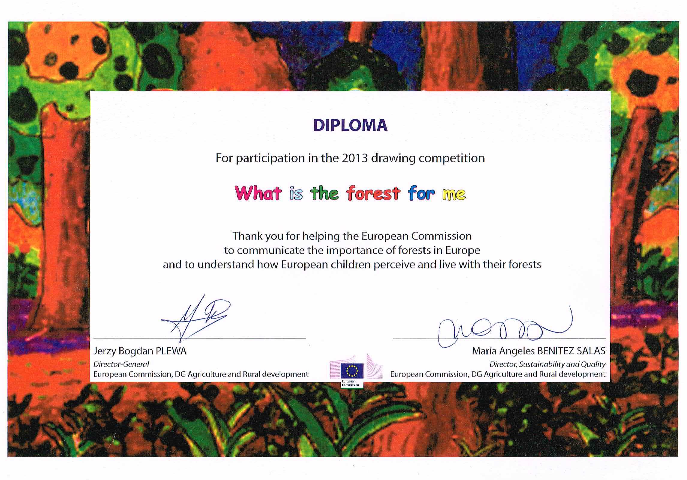 W styczniu 2013r. uczniowie klas I-III szkoły podstawowej wzięli udział w konkursie plastyczym "What is the forest for me?" ("Czym jest dla mnie las?"). Konkurs skierowany był do najmłodszych uczniów państw członkowskich Unii Europejskiej. Nasza szkoła wysłała do Brukseli 22 prace konkursowe.