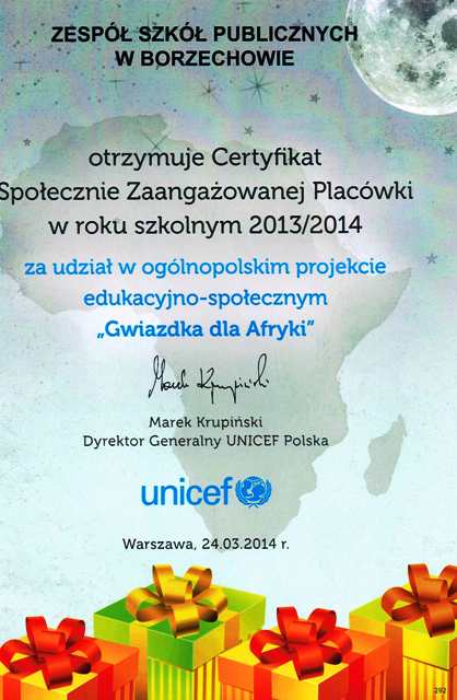 W miesiącach październik- grudzień 2013r. braliśmy udział w projekcie "Gwiazdka dla Afryki". Projekt ten miał za zadanie uwrażliwić uczniów na problemy współczesnego świata i potrzeby dzieci w krajach najbiedniejszych. Celem projektu było przekazanie dzieciom i młodzieży wiedzy na temat działań humanitarnych podejmowanych przez UNICEF na świecie, a także kształtowanie postawy zaangażowania społecznego wśród młodych ludzi i ich rodzin oraz znajomych. W ramach akcji zbierane były fundusze na kampanię szczepień dzieci w Sierra Leone.